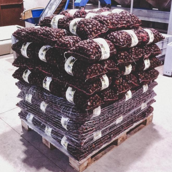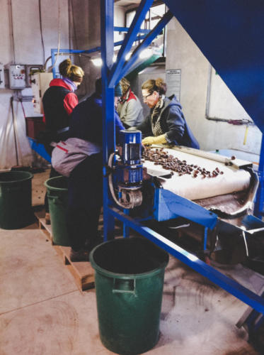 Dopo la raccolta i marroni vengono bagnati in acqua fredda, asciugati, selezionati, spazzolati e venduti nelle varie pezzature confezionati in sacchi di rete da 5 Kg oppure sfusi in big bags da 1 tonnellata.